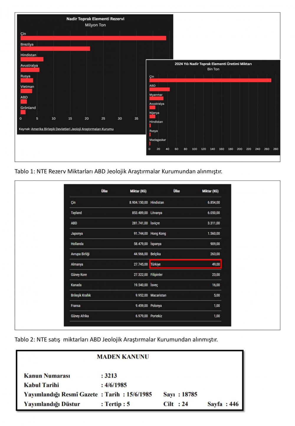 Türkiye’de ifade edilen rezervleri basında yer aldığı kadar çok olmasa da son derece önemli elementler olması sebebiyle ruhsatları yabancı bir şirkete verilemeyecek kadar değerli, stratejik elementlerdir. Rezervler ve üretimler hakkındaki tablolar ektedir (Tablo 1 ve Tablo 2). Birim hacimdeki miktarları (tenörleri) düşük olduğu için bu elementleri mevcut kayalardan, minerallerden ayırmak yüksek teknoloji istemektedir. Türkiye, Ekim 2024 yılında Çin ile müşterek bir pilot tesis yaparak NTE’leri elde etmek üzere bir sözleşme de yapmıştır.