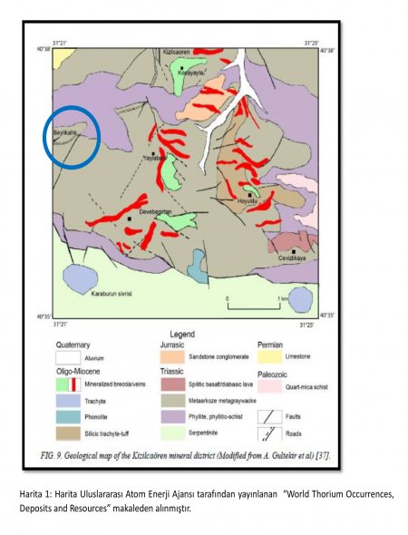 Ekte bulunan harita incelendiğinde NTE yataklarımız ile Toryum yataklarımız iç içedir (Harita 1). NTE’ler daha ziyade Metaarkoz, Metagrovak adlı kayaçların içindeki Basnazit mineralleri içinde, Toryum ise aynı kayalar içindeki Monazit mineralleri içindedir. Bir başka deyişle Maden Kanunumuza göre bu bölgedeki ruhsatların başka kişi veya kurumlara verilmesi mümkün değildir. Nadir Toprak Elementleri 4. Grup C bölümünde Toryum ise 4. Grup Ç bölümündedir. Maden Kanunumuzun 50. Maddesine göre 4Ç bölümünde bulunan Uranyum, Toryum gibi Nükleer enerji elde edilmesinde kullanılan elementlerin bulunduğu bölgelerin satış iradesi Sayın Cumhurbaşkanımıza verilmiştir. Madde aynen şöyledir: “Madde 50 – Bu Kanunun yürürlük tarihinden sonra toryum ve uranyum madenlerinin aranması ve işletilmesi bu Kanun hükümlerine tabidir. Üretilen cevher Devlete veya Cumhurbaşkanınca tespit edilecek yerlere satılır.”