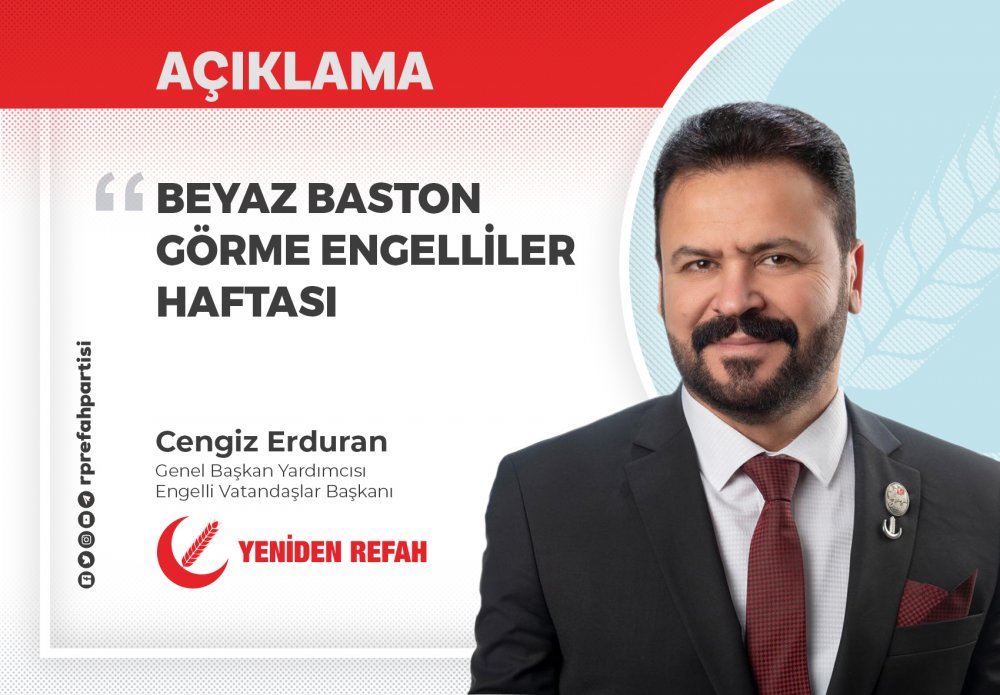 Yeniden Refah Partisi olarak, her yıl 7–14 Ocak tarihleri arasında idrak edilen Beyaz Baston Görme Engelliler Haftası vesilesiyle, görme engelli vatandaşlarımızın toplumsal hayatta eşit, onurlu ve bağımsız bireyler olarak yer almasının önemini bir kez daha vurguluyoruz.