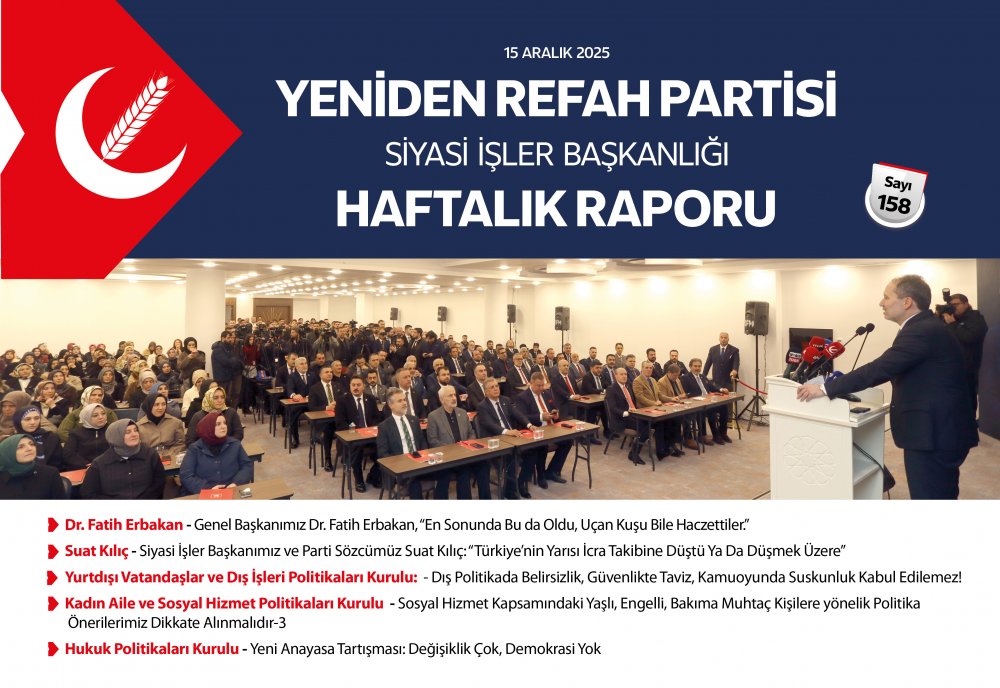 Siyasi İşler Başkanlığımızın haftalık raporu yayınlanmıştır. Yayının detaylarına aşağıdaki linkten ulaşabilirsiniz. Yayın Tarihi: 15 Aralık 2025 | Yayın Saati: 17:50:20