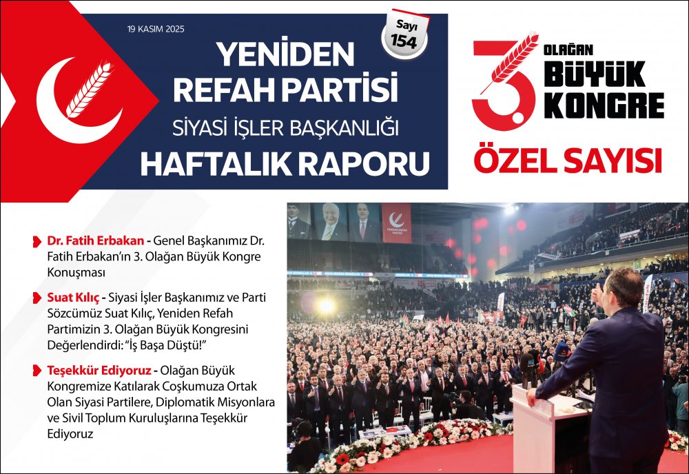 Siyasi İşler Başkanlığımızın haftalık raporu yayınlanmıştır. Yayının detaylarına aşağıdaki linkten ulaşabilirsiniz. Yayın Tarihi: 19 Kasım 2025 | Yayın Saati: 14:38:13