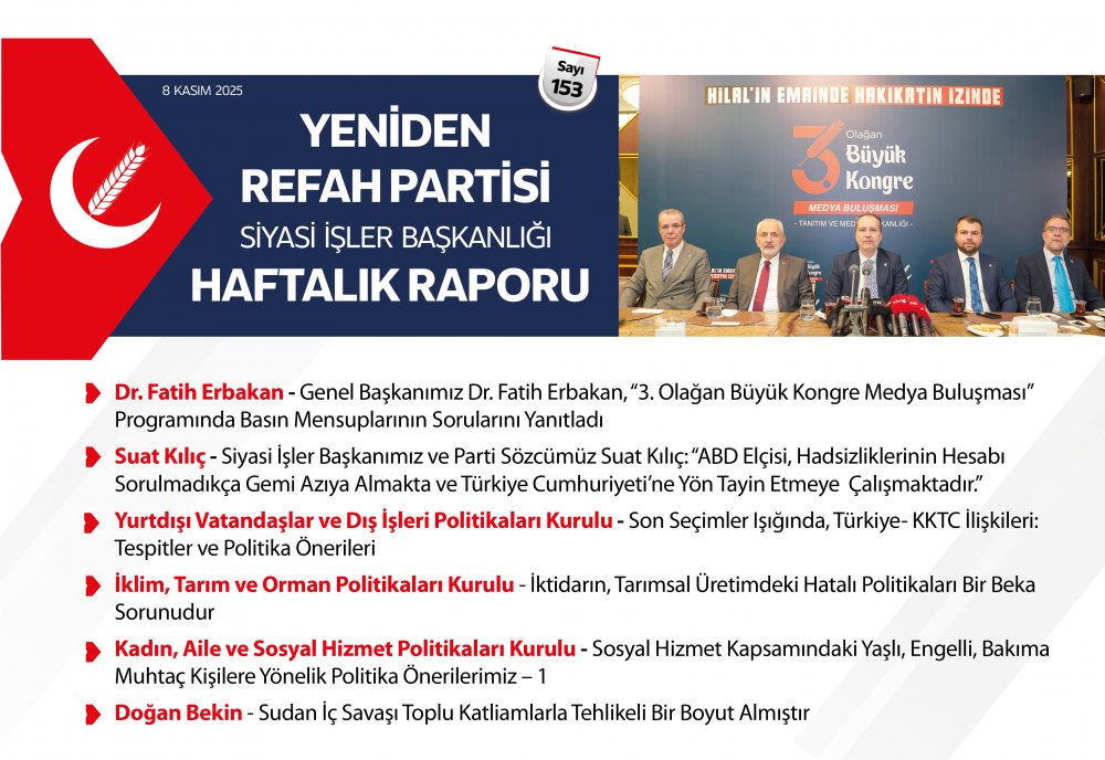 Siyasi İşler Başkanlığımızın haftalık raporu yayınlanmıştır. Yayının detaylarına aşağıdaki linkten ulaşabilirsiniz. Yayın Tarihi: 8 Kasım 2025 | Yayın Saati: 16:08:19